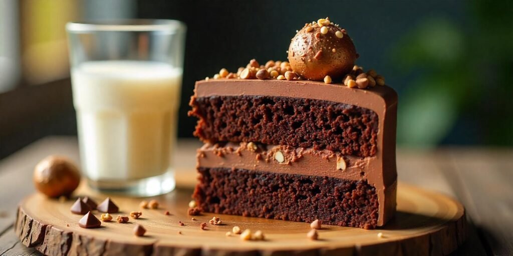 chocolate cake layers filled with Nutella buttercream and crushed Ferrero Rocher.